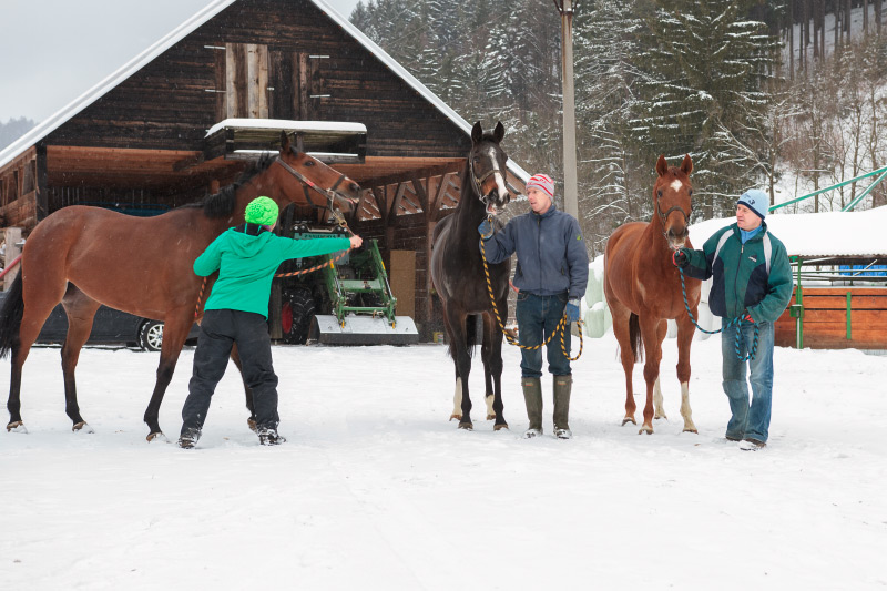 Lehce sněží, několik koní se prochází v kolotočích. Od stájí se občas ozve zabouchání kladiva. Dokončují tam nové dveře venkovních boxů. A do toho František Holčák hlásí: „Pěkná zima, máme hezké počasí, sněhu je tak akorát. Problémy jsou trochu jen když zasvítí sluníčko a pak přimrzne taková ta krusta, to musíme být na koníčky opatrní. Ale jinak je vše v pohodě, personál také. Takže si nemůžeme stěžovat.“